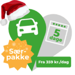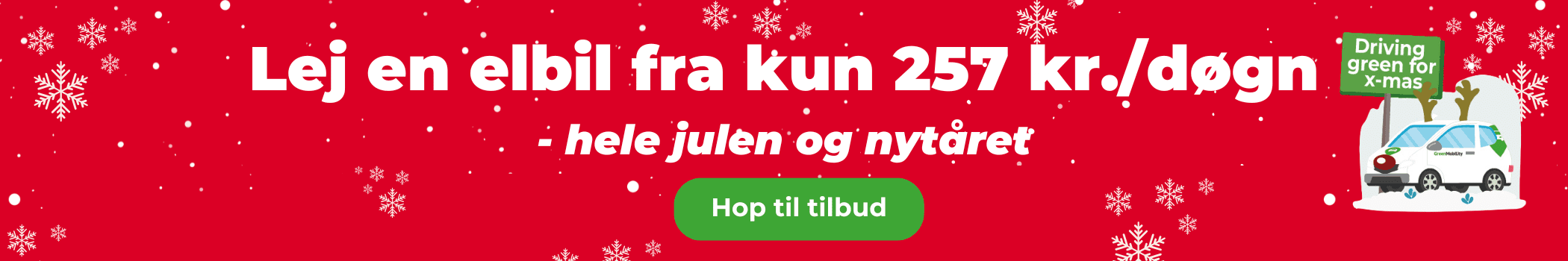 Juletilbuddet på døgnpakker er tilgængeligt i København t.o.m. 4. januar 2026. Pakkerne er gyldige i 30 dage fra købet. Priserne gælder for Renault Zoe og Megane. Tillæg for Polestar 2, ID. Buzz og varevogne ses under pakkerne. Tilbuddet kan ikke kombineres med GreenSaver. Aktiver pakken under “Mine pakker” i appen før turstart. Kører du længere end de inkluderede døgn eller km, kører du for 2,25 kr./min. og 2,25 kr./km.