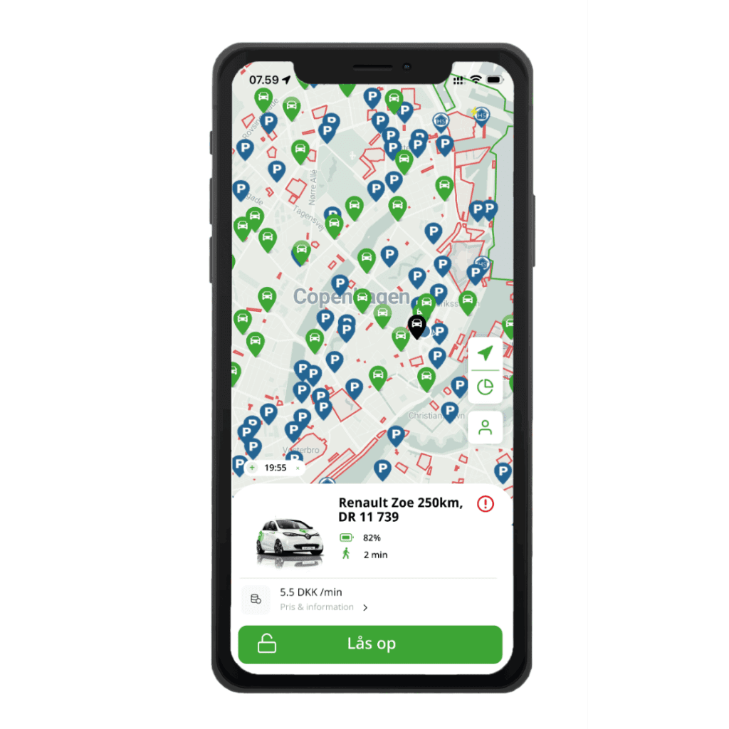 I appen finder, reserverer og låser du bilen op. Appen er nøglen til alle vores elbiler! Den viser dig altid, hvor din nærmeste bil er og hvor meget strøm, den har. Når du har fundet en elbil, er den automatisk reserveret til dig i 20 minutter. De første 20 min. reservation er gratis pr. kørt tur hver dag. Derefter koster reservationen 1 kr./min.