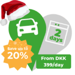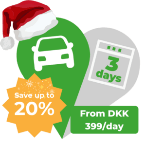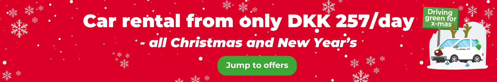 The Christmas offer on day packages is valid in Copenhagen until the 4th of January 2026. Packages are valid for 30 days from the purchase. Prices apply to Zoe and Megane. Fees for Polestar, vans, and ID. Buzz is shown at purchase. Activate the package under “My Packages” in the app before starting your trip. The offer can’t be combined with GreenSaver. If you exceed the included days or kilometers, the rate is DKK 2,25/min and DKK 2,25/km.